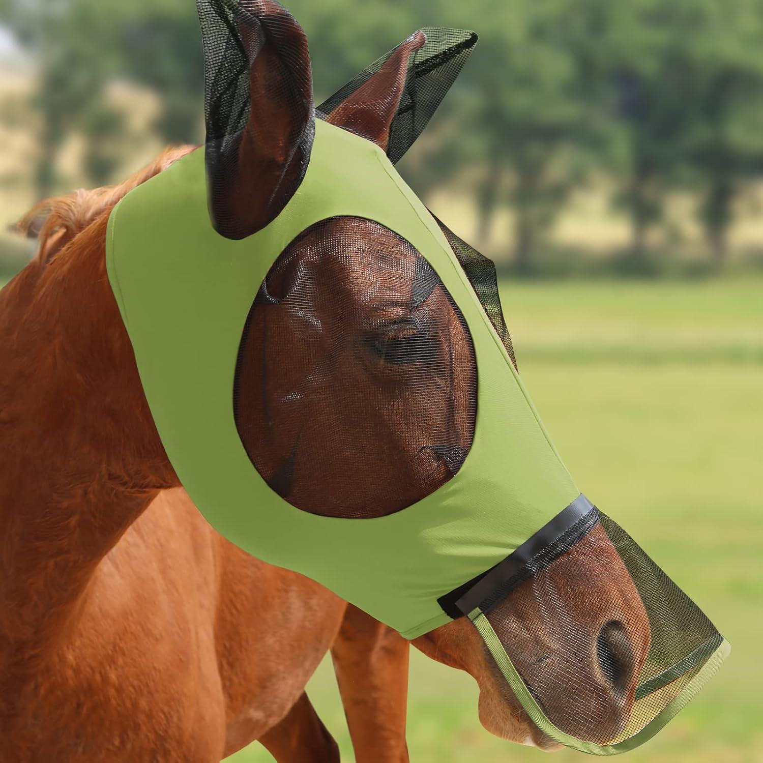 Horse Fly Mask with Nose Skirt Fine Mesh Sleek Pull-on Design Green Tribe L (Full Size)