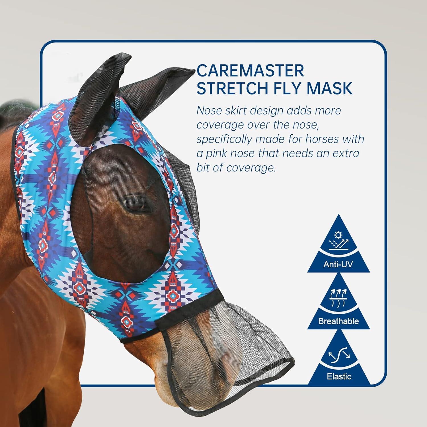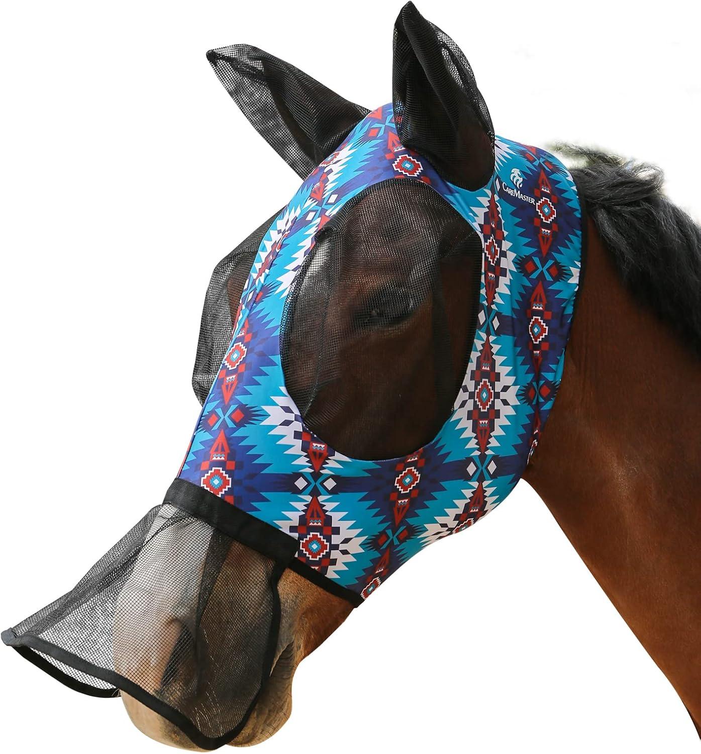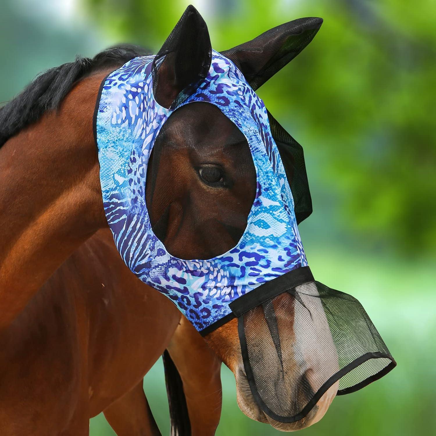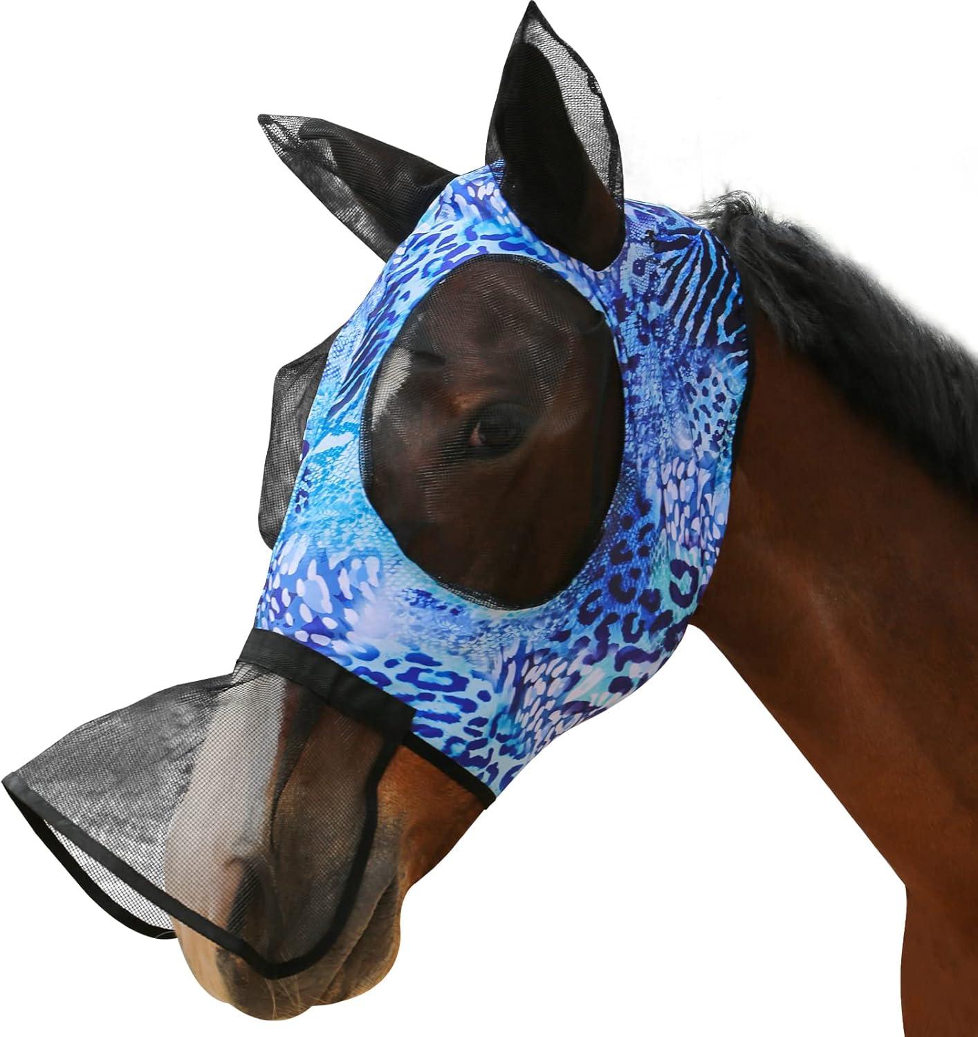 Horse Fly Mask with Nose Skirt Fine Mesh Sleek Pull-on Design Skirt Blue Leopard L Full Size