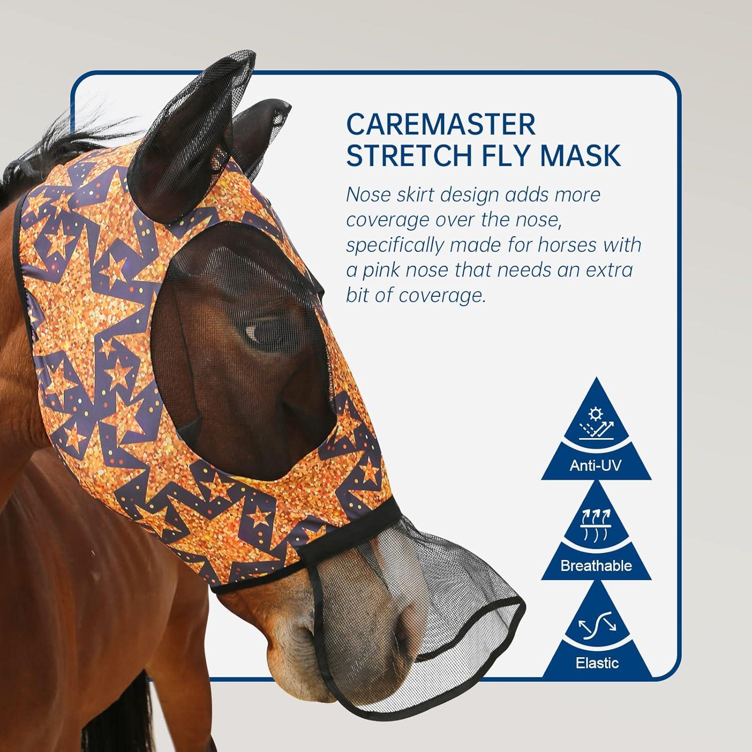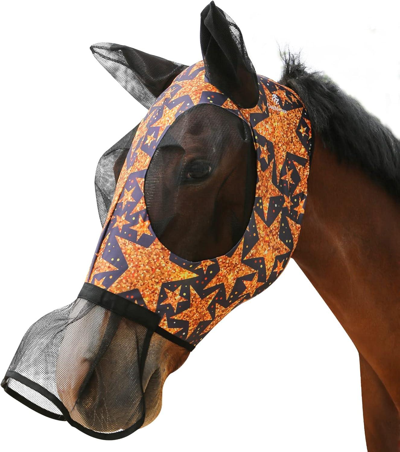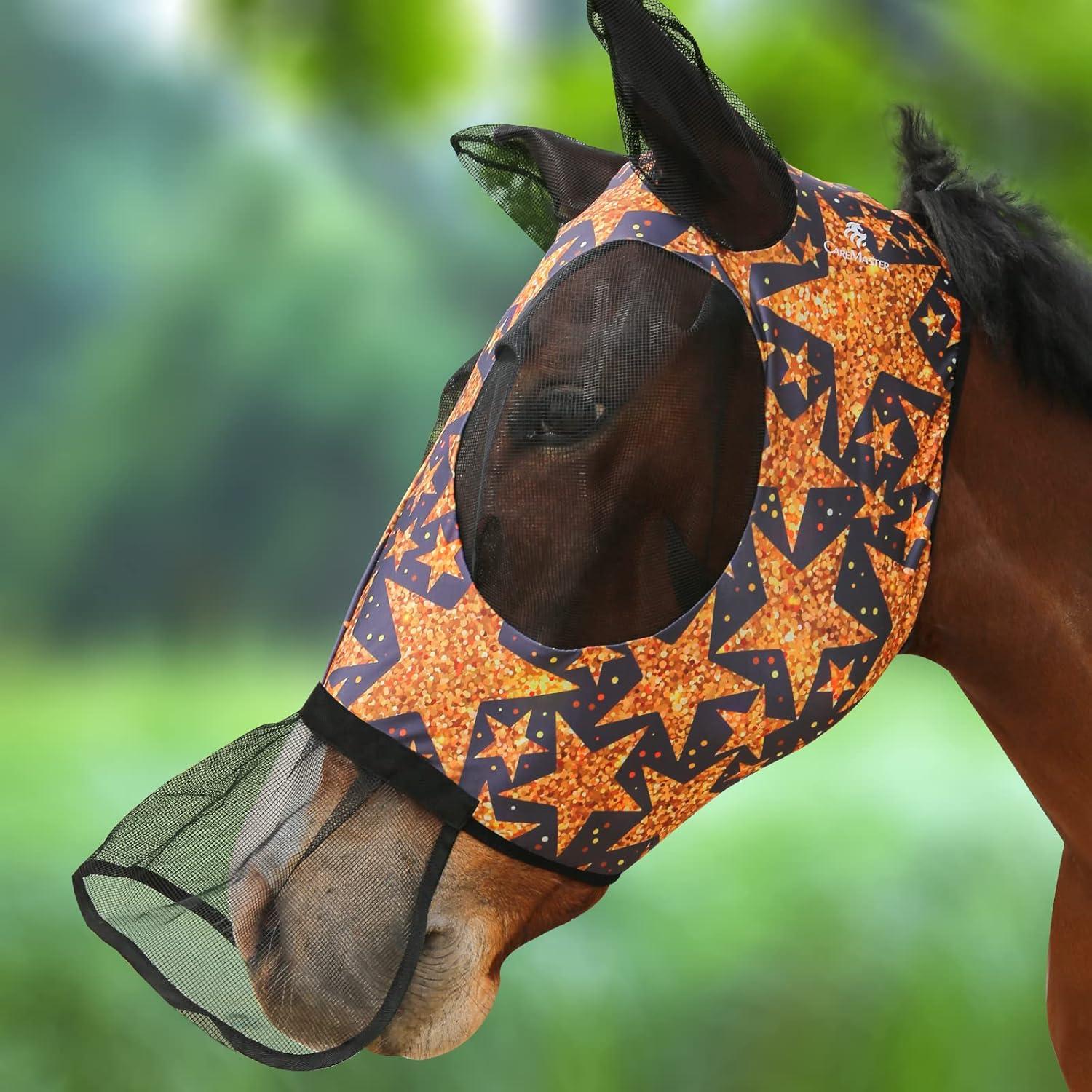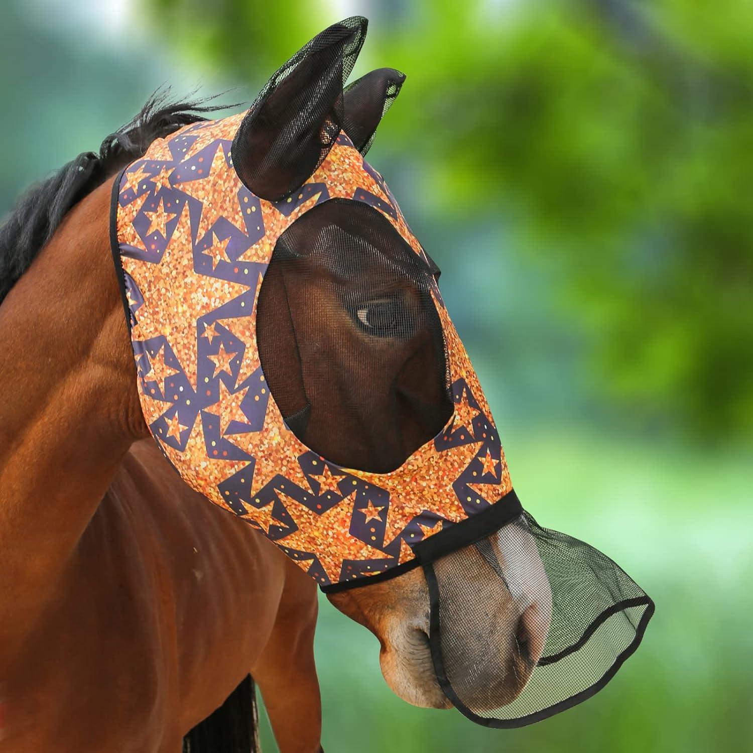 Horse Fly Mask with Nose Skirt Fine Mesh Sleek Pull-on Design Skirt-Golden Stars (L; Full Size)
