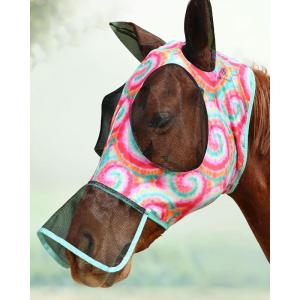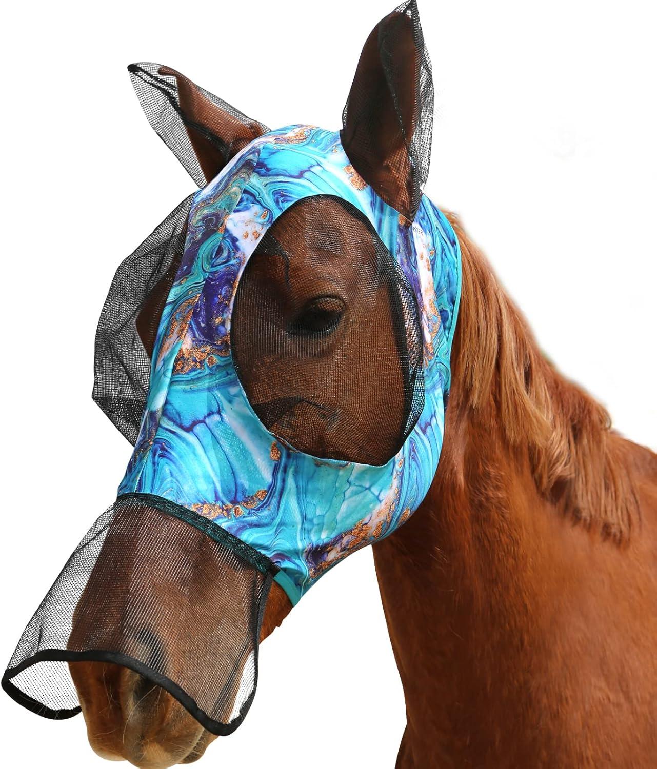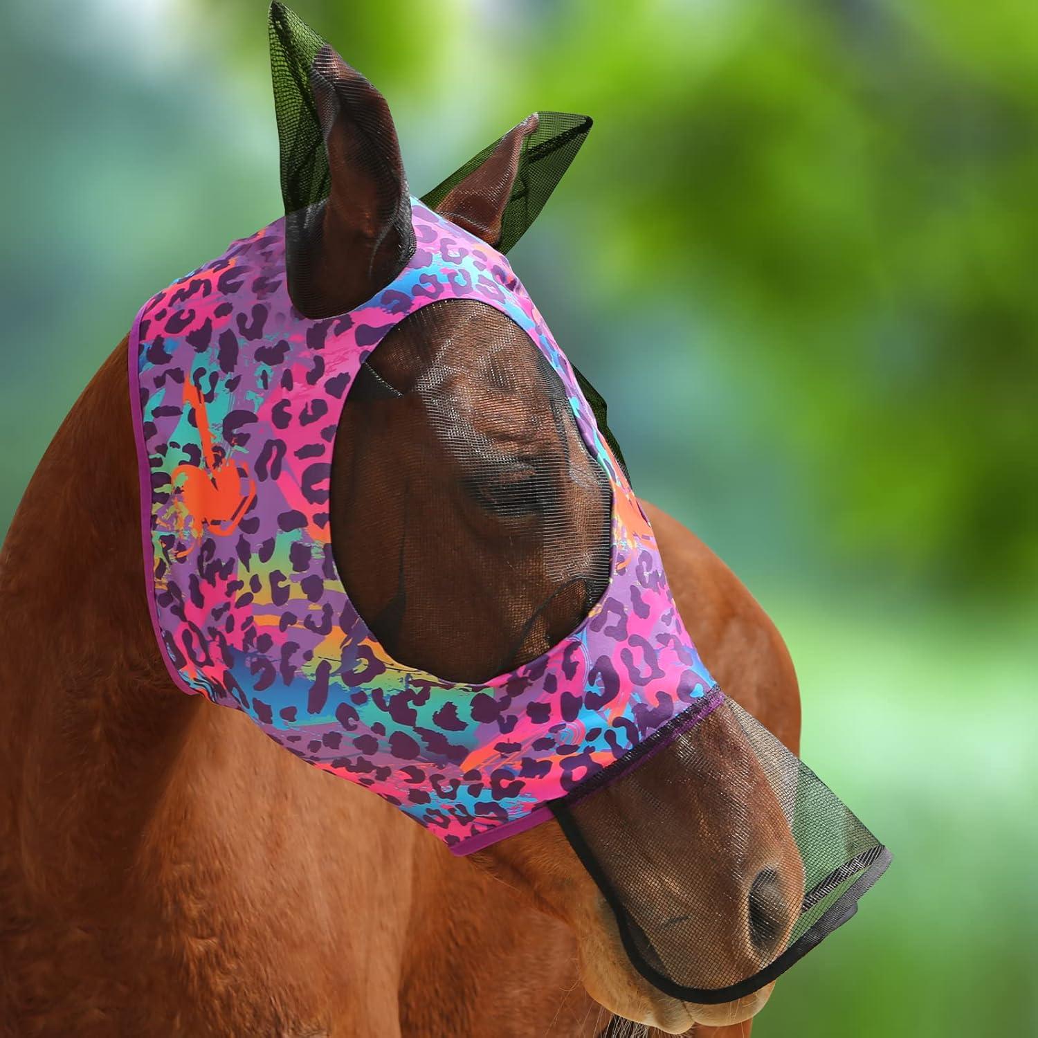Horse Fly Mask with Nose Skirt Fine Mesh Sleek Pull-on Design Skirt Blue Leopard L Full Size
