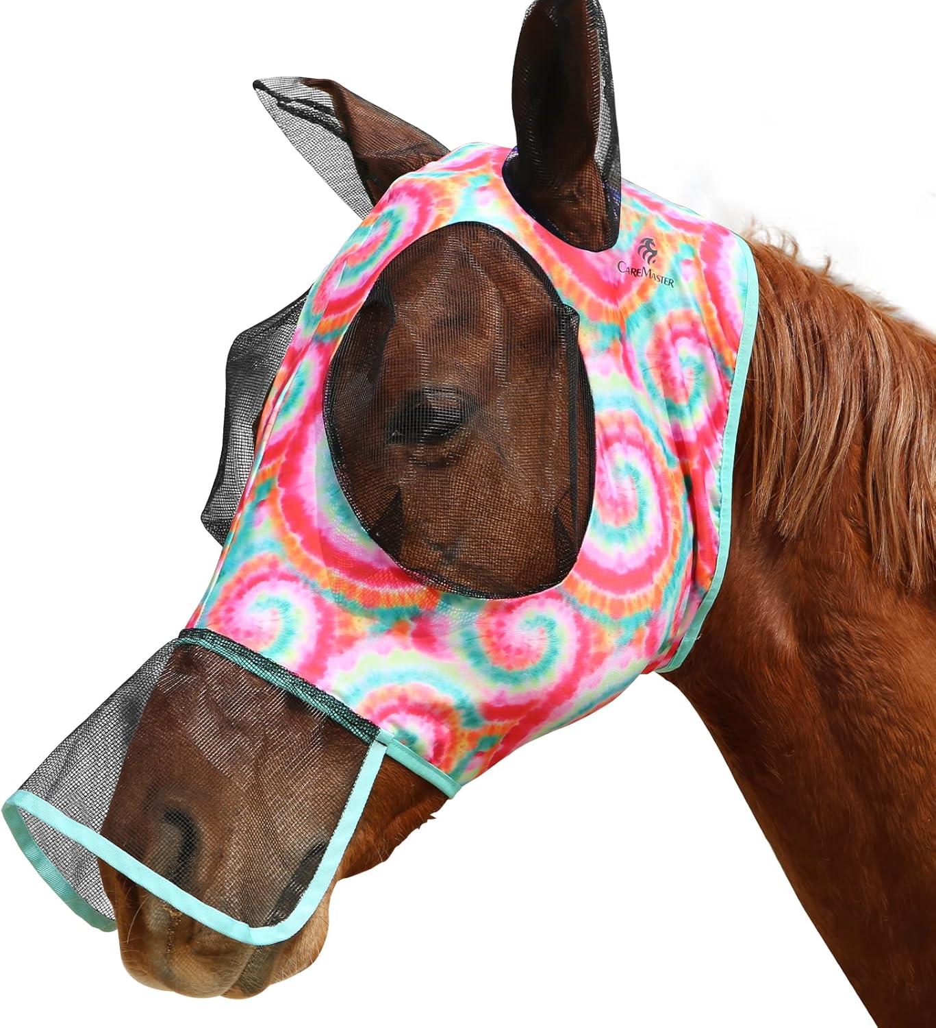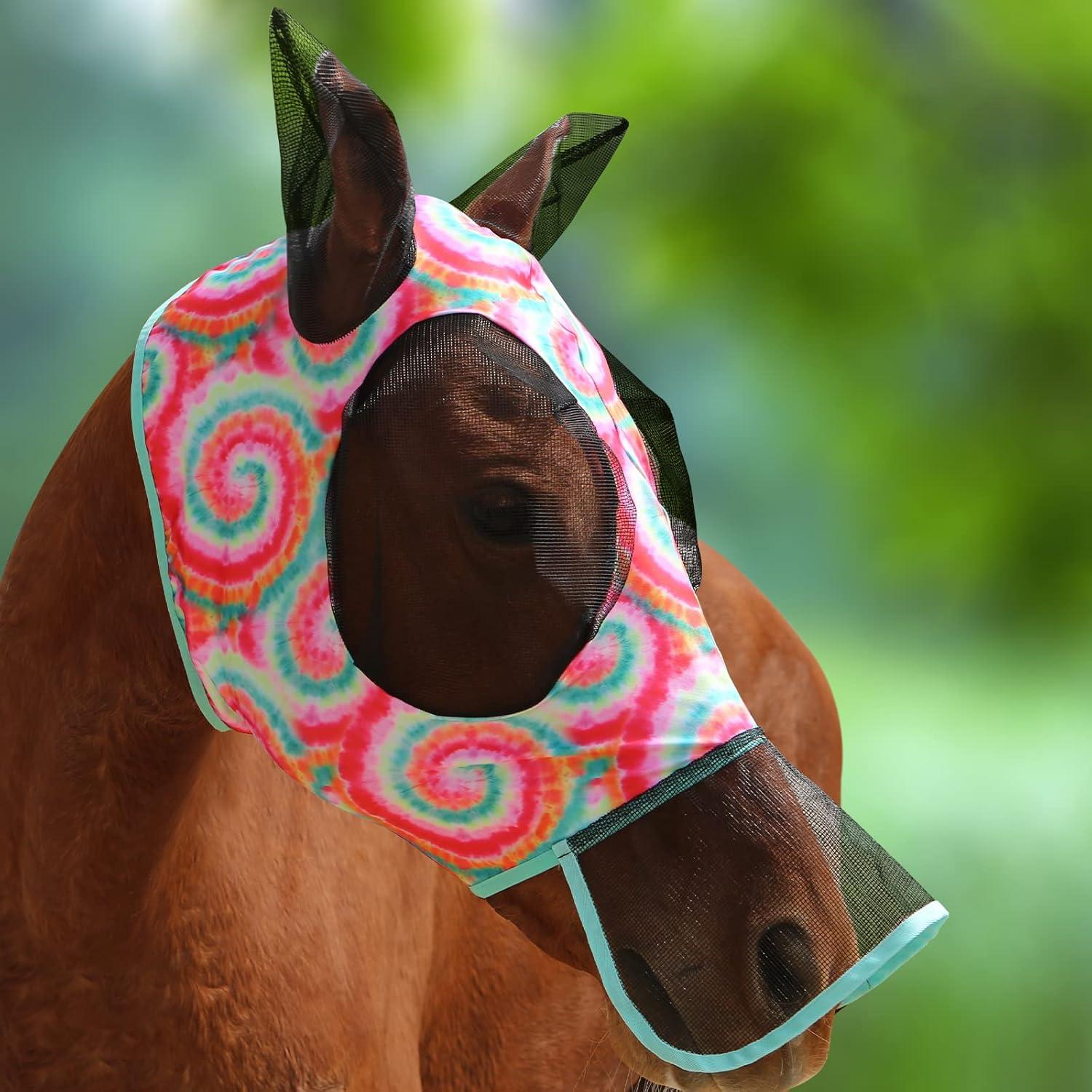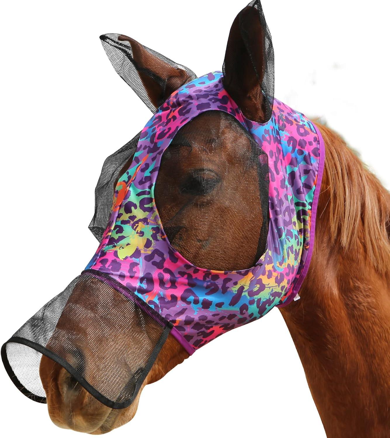 Ultra Lightweight UV-Proof Full Visibility Stretchy Horse Fly Mask Long Nose with Ears-Rainbow Circle (L; Full Size)