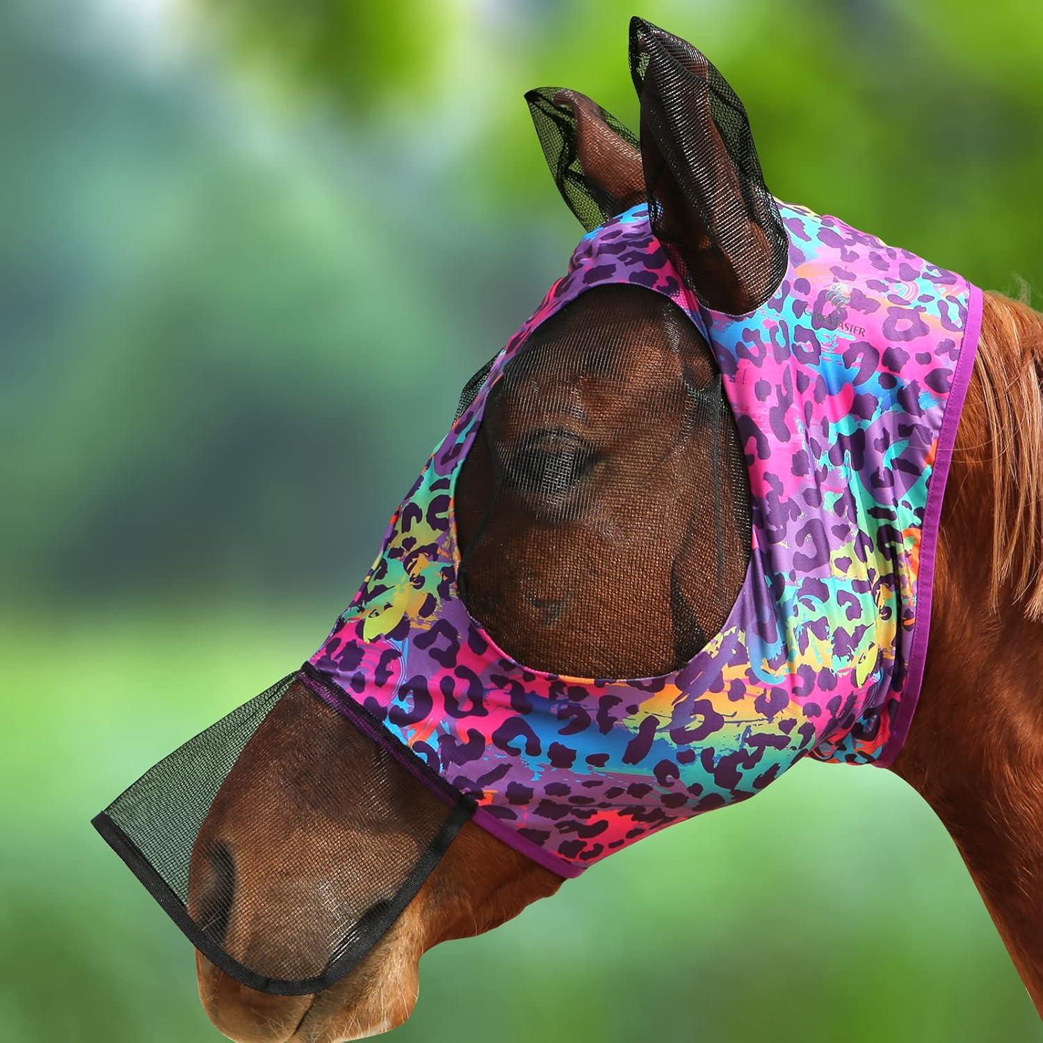 Ultra Lightweight UV-Proof Full Visibility Stretchy Horse Fly Mask Long Nose with Ears-Pink Leopard (L; Full Size)