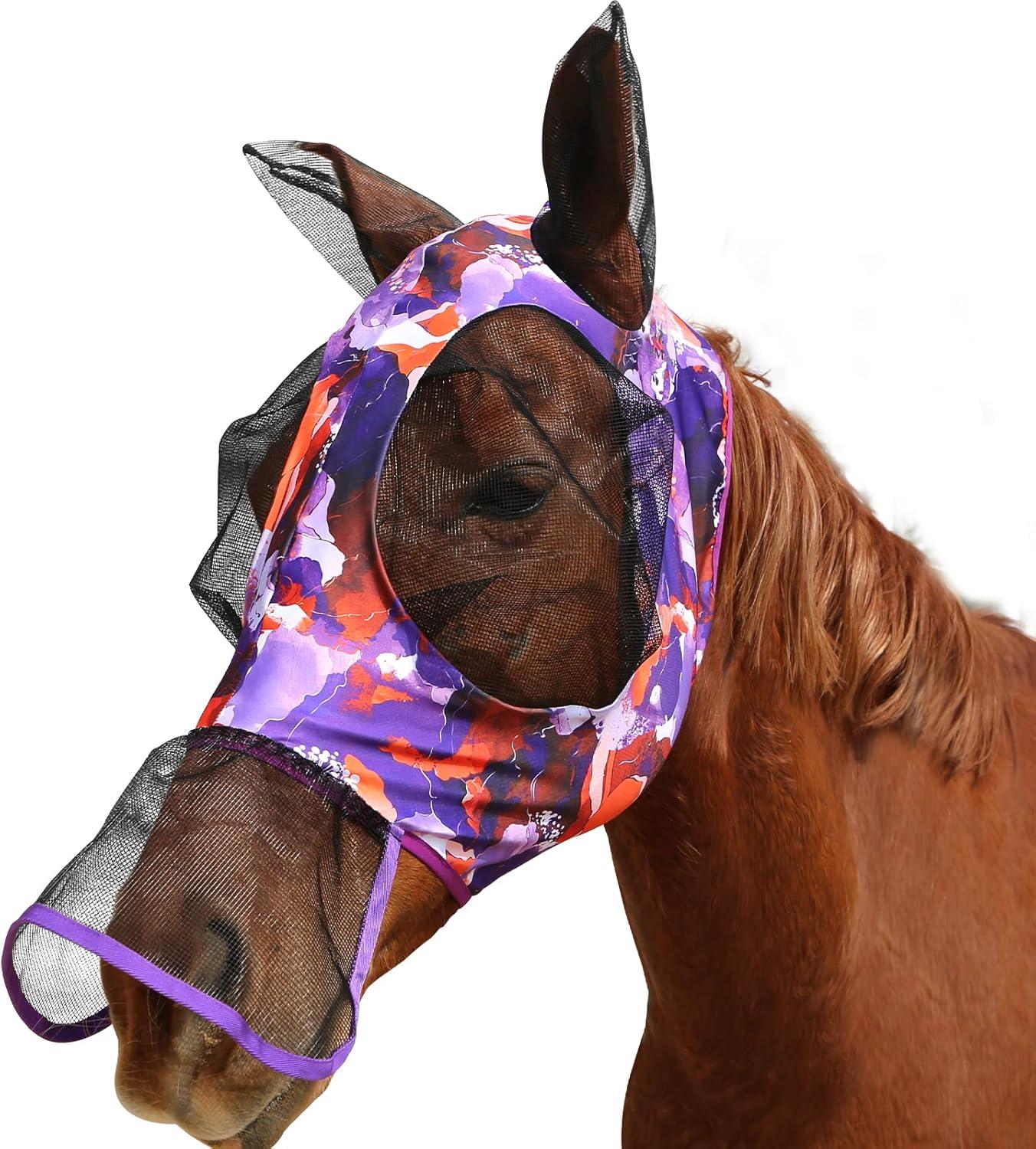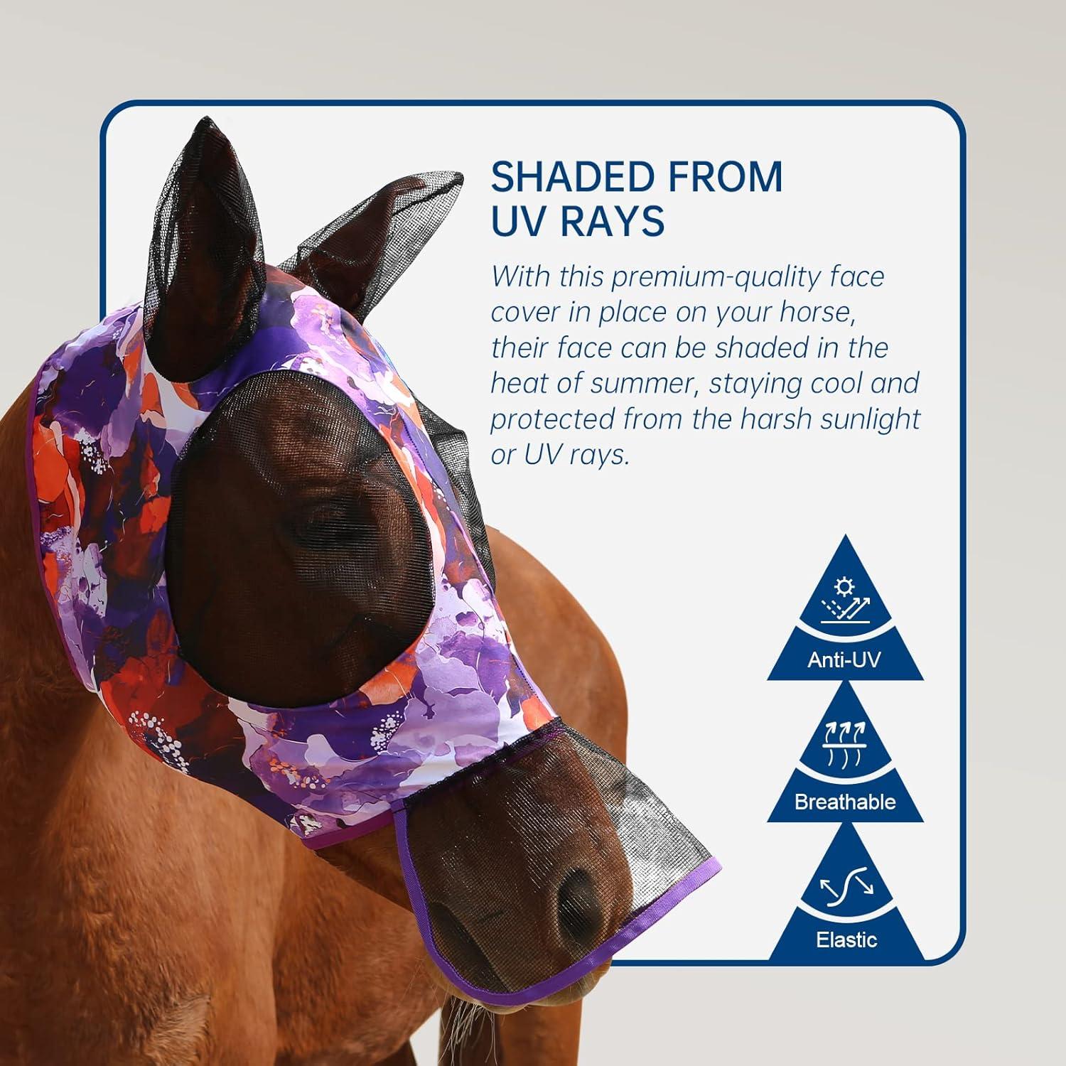 Ultra Lightweight UV-Proof Full Visibility Stretchy Horse Fly Mask Long Nose with Ears-Purple Flowers (L; Full Size)