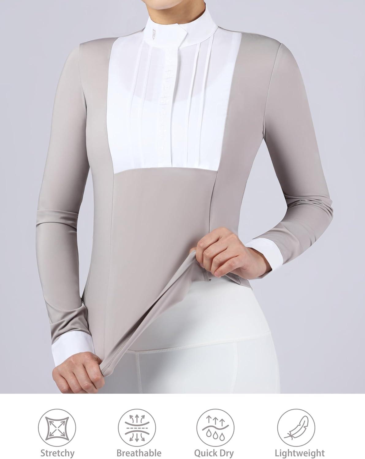 Harrison Howard Equestrian Pleated Bib Show Shirt Rider Top Horse Riding Long Sleeve with Embroidery(Grey)