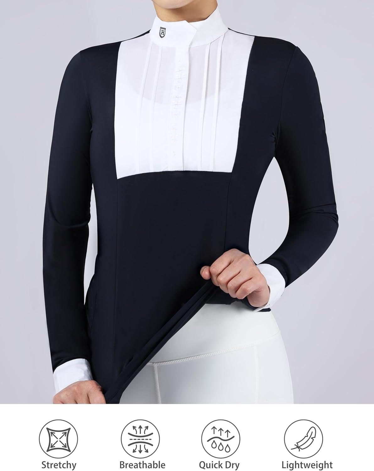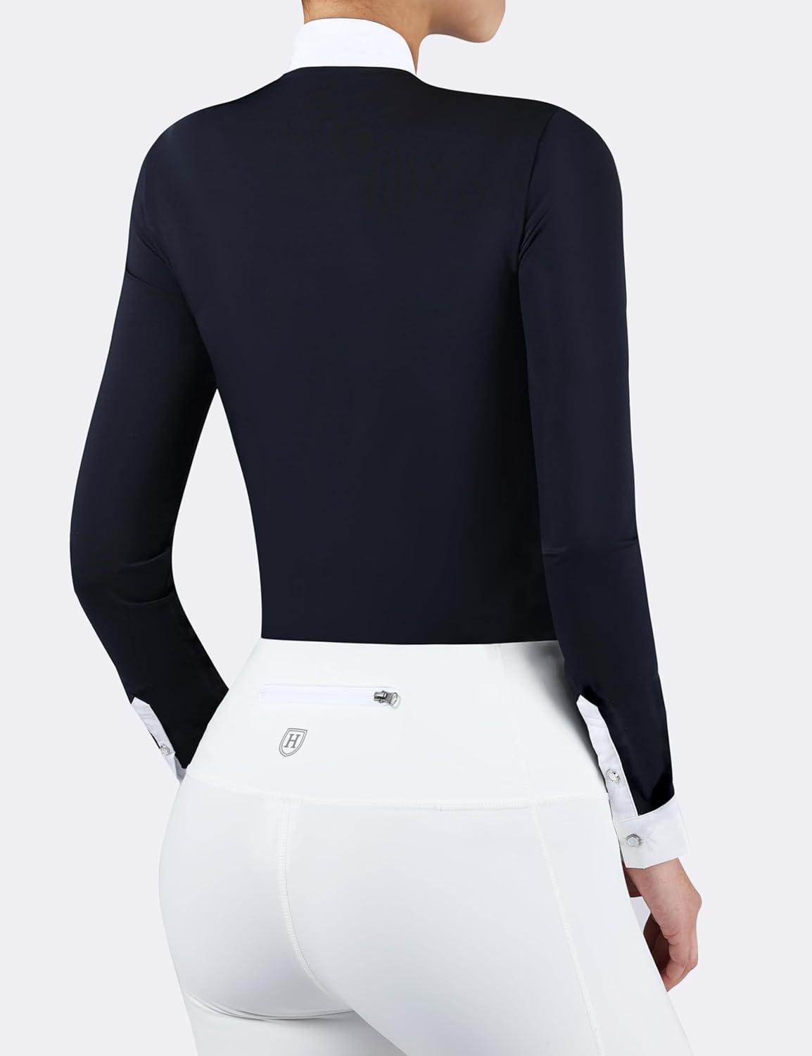 Harrison Howard Equestrian Pleated Bib Show Shirt Rider Top Horse Riding Long Sleeve with Embroidery(Navy)