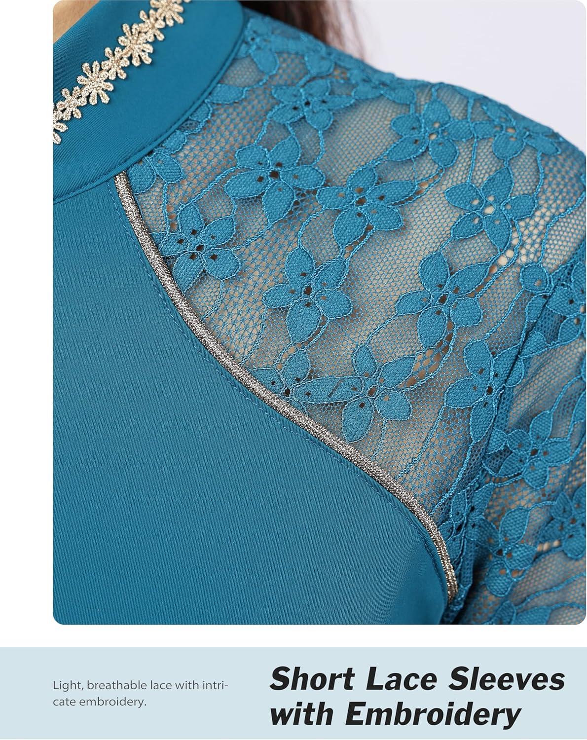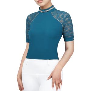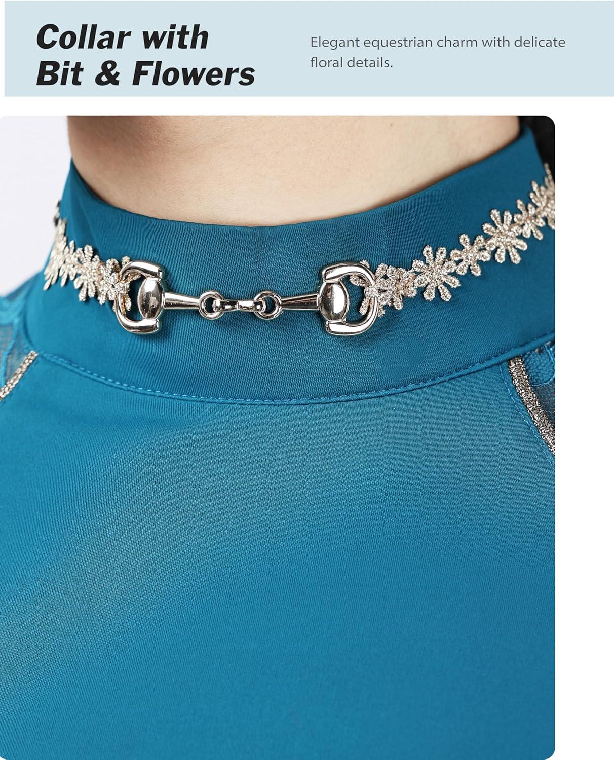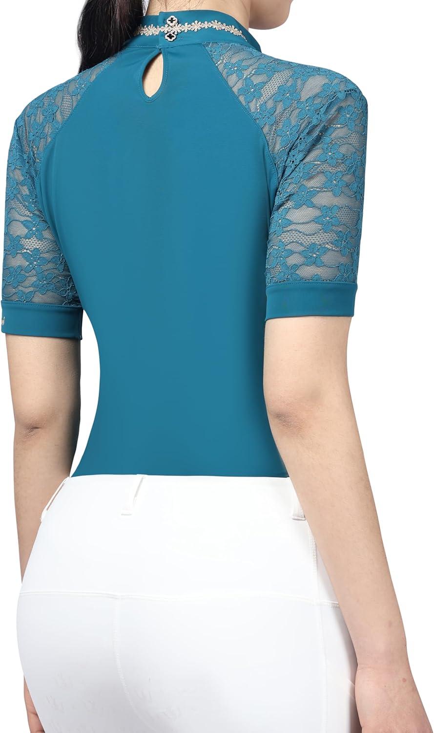 Harrison Howard Women’s Slim Fit Show Shirt with Lace Sleeves and Iconic Bit Breathable Comfortable Rider Top(Teal)