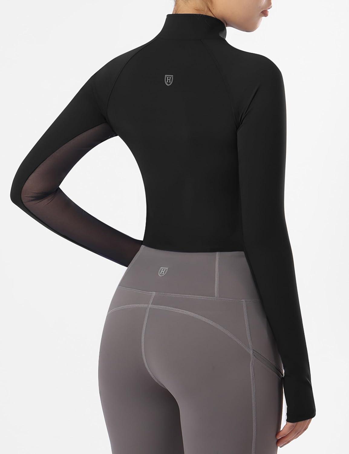 Harrison Howard Equestrian Tops Female Long Sleeve Half Mesh Arm Design Quick-Dry Summer Top with Stylish Neckline(Black)
