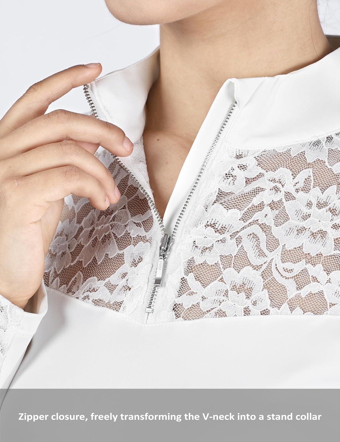Harrison Howard Ladies Long Sleeve Lace Rider Top with Exquisite Lace Spliced Sleeves Slim Fit Show Shirt(Oval White)