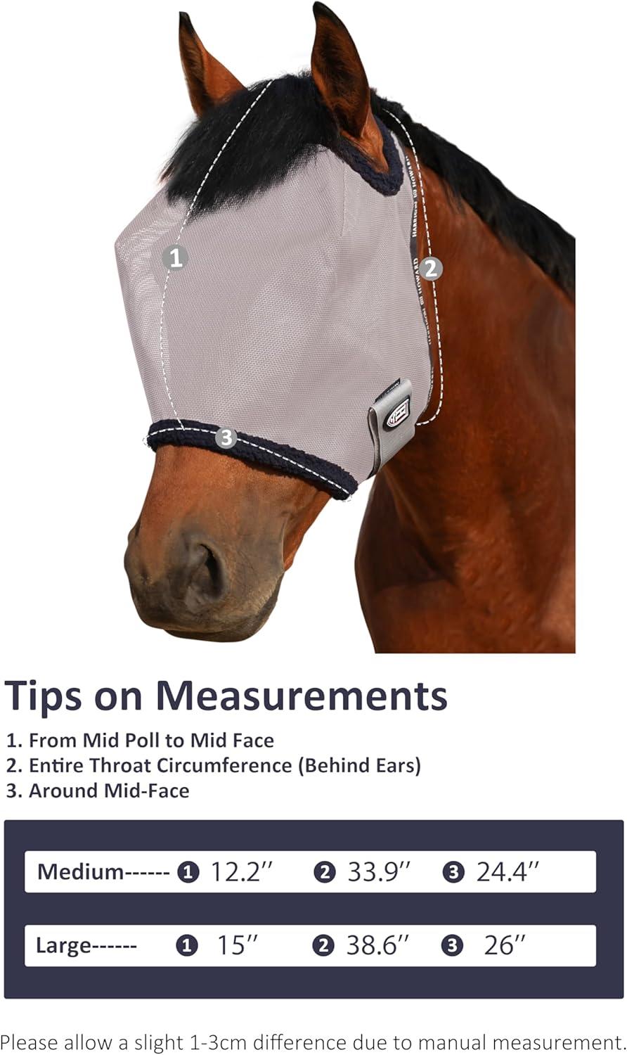 SOFT FLEECE TRIM: Softly padded edges to reduce pressure marks on the horse's skin, making this fly mask super comfortable to wear. In the meantime, it keeps debris and flying particles from getting under the fly mask.