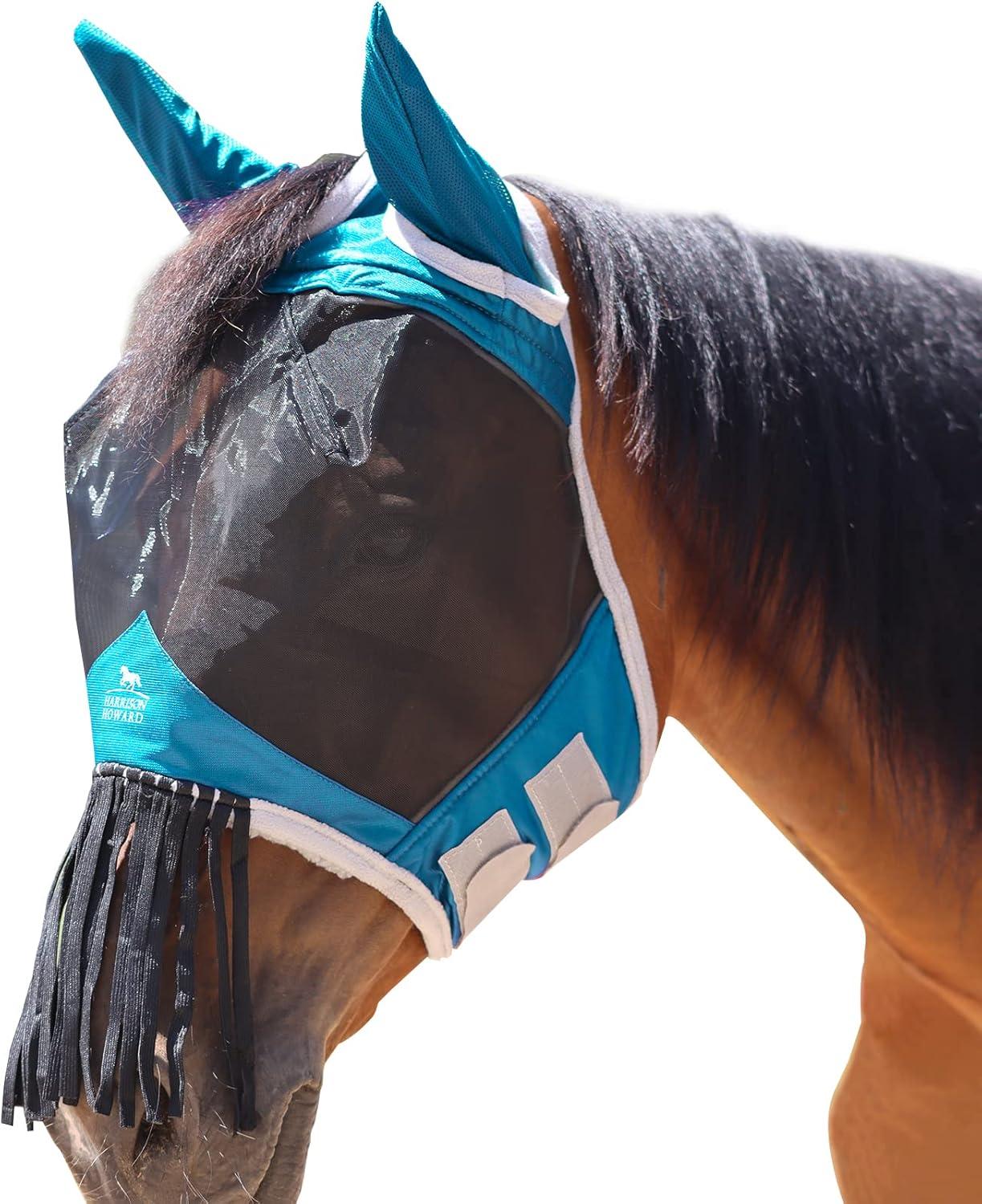 Harrison Howard CareMaster Horse Fly Mask with Ears and Nose Fringe Fly Protector Defender Mask Piano Black Full Size(Sky Blue)