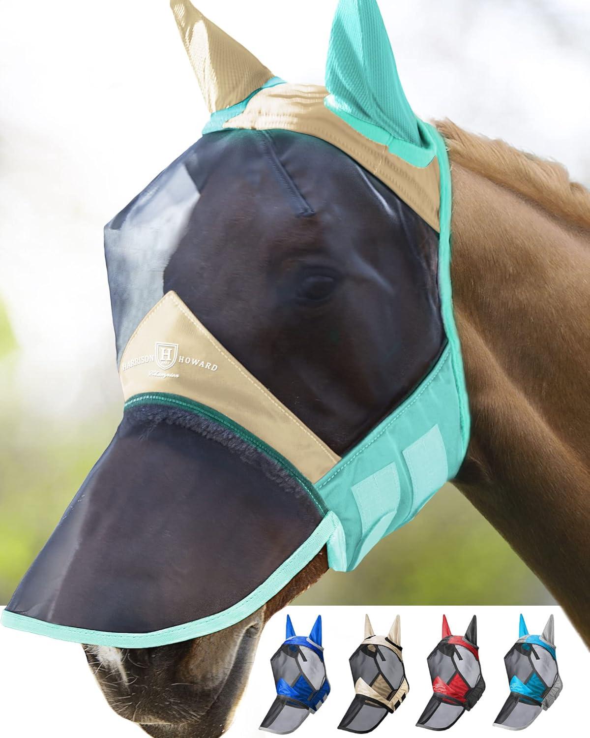 Harrison Howard CareMaster Pro Luminous Horse Fly Mask Large Eye Space Long Nose with Ears UV Protection for Horse Sky Blue L Full Size(Champagne Gold/Mint)