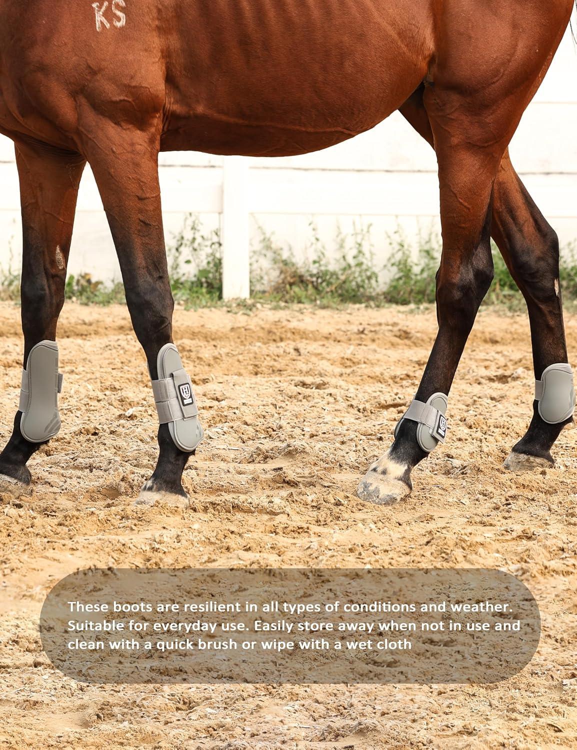 SHOCK ABSORPTION AND PROTECTION: The boots are made of a highly durable PU shell and shock absorbing Neoprene, gives the horse extra tendon support and protection from his back hooves, keep their vulnerable tendons and ligaments well protected for a long period of time.