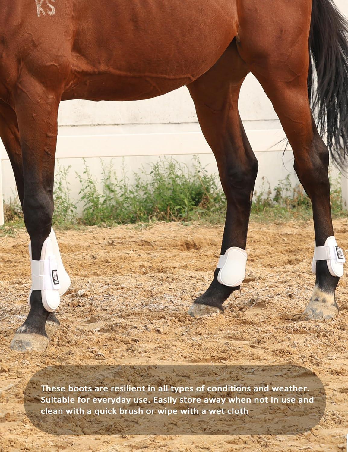 SHOCK ABSORPTION AND PROTECTION: The boots are made of a highly durable PU shell and shock absorbing Neoprene, gives the horse extra tendon support and protection from his back hooves, keep their vulnerable tendons and ligaments well protected for a long period of time.