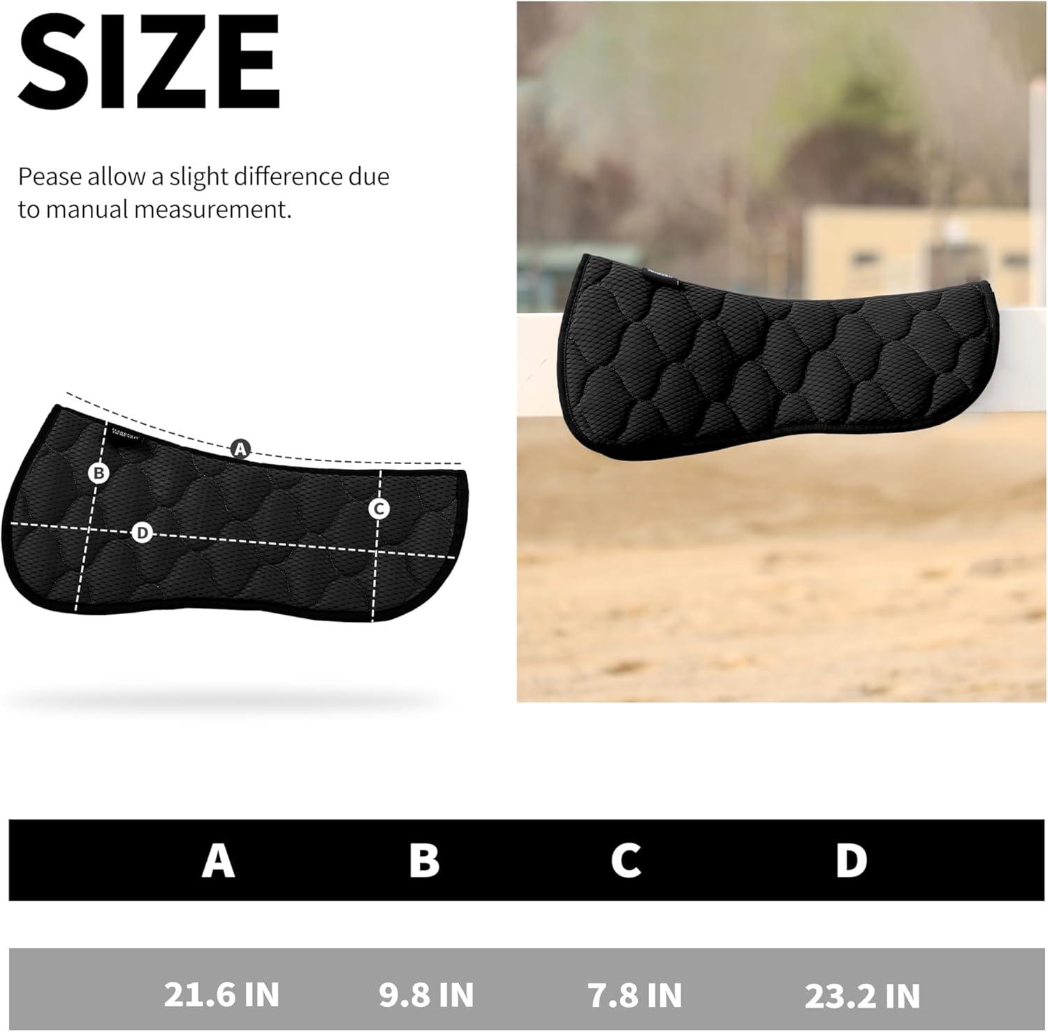 Versatile Fit: Whether dealing with ill-fitting saddles, unique back shapes, or shifting balance during rides, this half pad adapts precisely to ensure a secure fit. Its lightweight design minimizes pressure, keeping your horse comfortable and unrestricted.