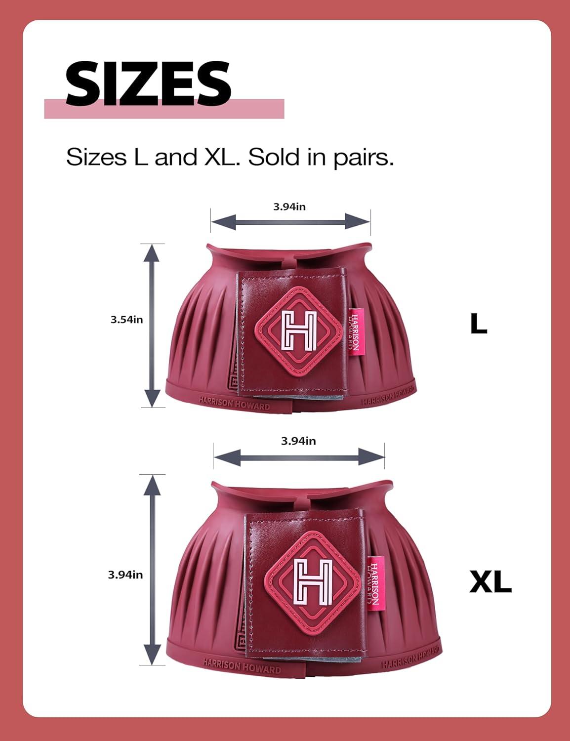 Harrison Howard Rubber Pull-on Bell Boots with Fleece Lining and Touch-Close Tapes Hoof Overreach Protection for Horses(Wine Red)